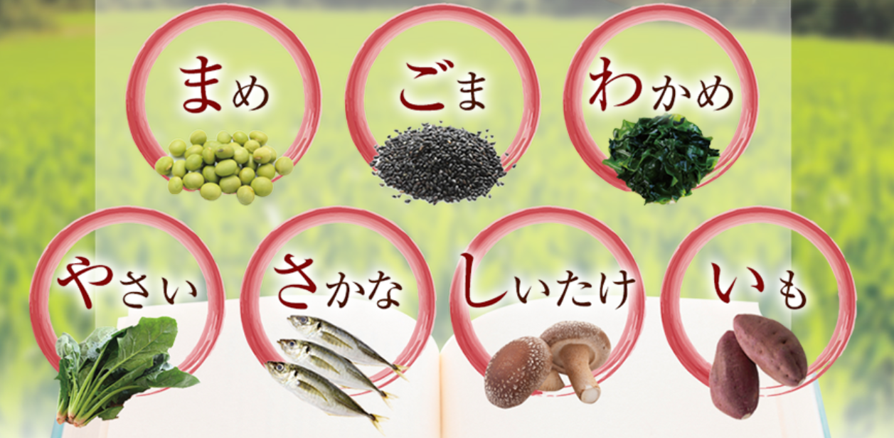 「まめ」「ごま」「わかめ」「やさい」「さかな」「しいたけ」「いも」、こちらの7種類の食材の頭文字を取って、「まごわやさしい」。